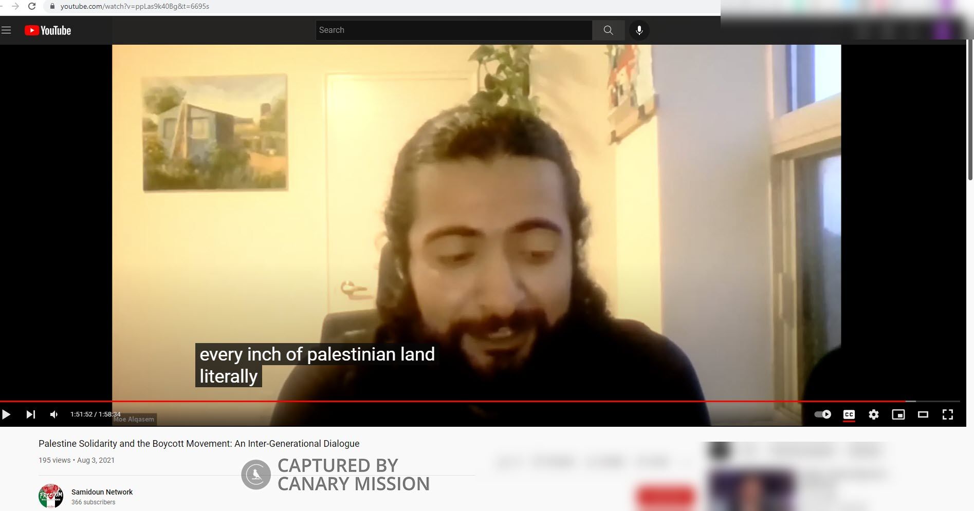 On September 25, 2021, Alqasem shared to Facebook a PYM webinar, which featured former Palestinian hunger striker, Maher al-Akhras. Al-Akhras gave the interview in Arabic, while seated behind a photo of Iranian Quds Force Commander, Qaseem Soleimani and co-founder and Secretary General of PIJ, Fathi Shaqaqi.