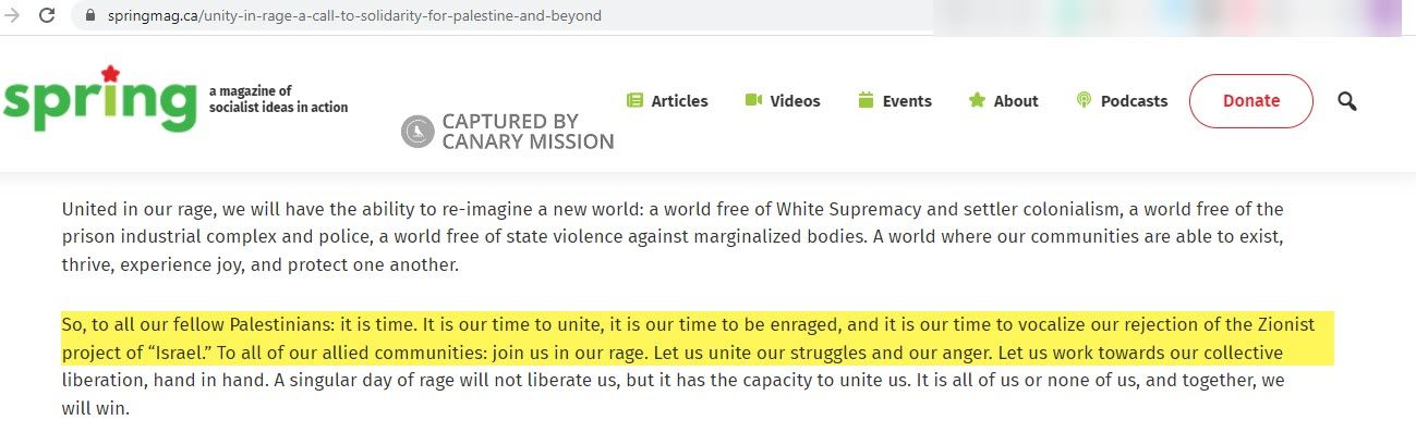 On May 11, 2021, Alqasem wrote an article in Spring Magazine titled: “The battle of Sheikh Jarrah,” in which he claimed that Israel “plans to ethnically cleanse the Palestinian residents of Sheikh Jarrah and Silwan.” Alqasem also wrote: “The continuous encroachment of the Zionist agenda on Palestine…will drive the Palestinian population to a moment of full-blown uprisings.”