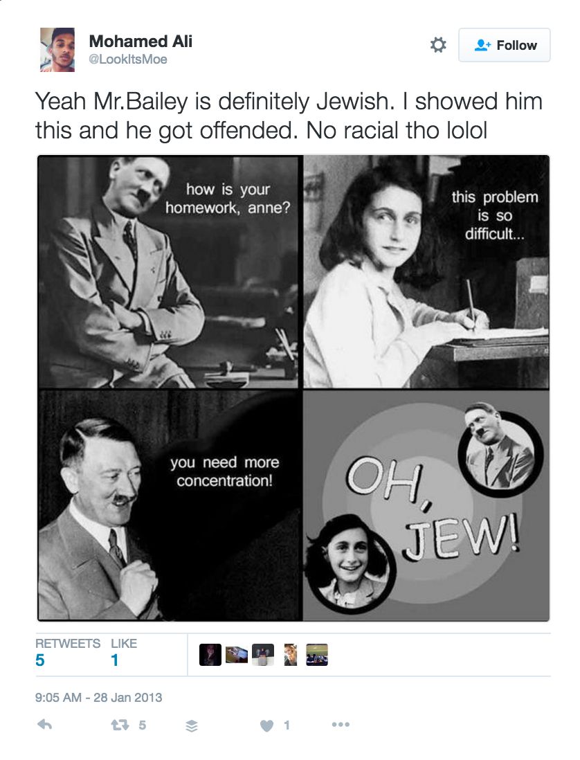 On October 12, 2012 — responding to another student on Twitter — Ali commented about students at Hume Fogg Academic Magnet High School, insulting them in Arabic as being “all Jews” — and adding an obscene remark: “Kolhom yahood. Kos ohktam. [They think they're the shit & they know everything.]”