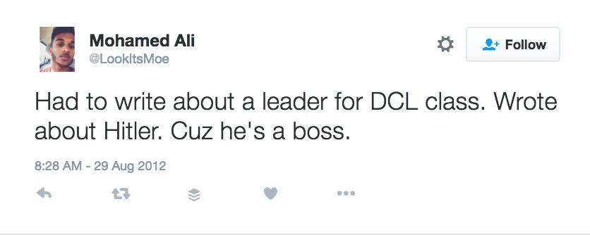 On August 29, 2012, Ali tweeted: “Had to write about a leader for DCL class. Wrote about Hitler. Cuz he's a boss.”