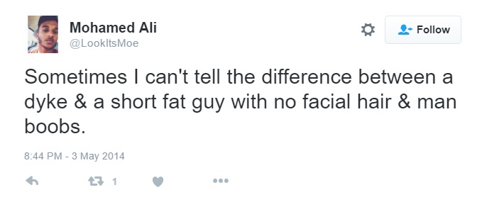 On May 2014, Ali tweeted: “Sometimes I can't tell the difference between a dyke & a short fat guy with no facial hair & man boobs.”