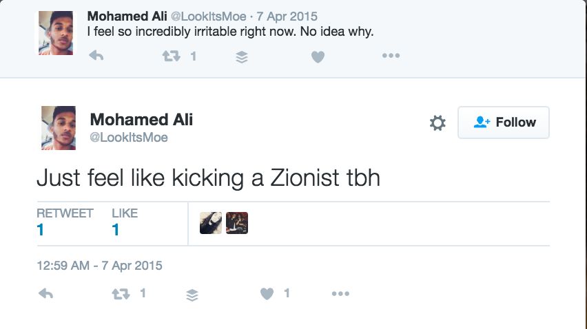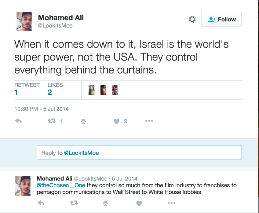 On December 27, 2015 — in response to a tweet that read : “The most morally army in the world, the Israeli army Leave A Comment !” — Hijer tweeted: “This is why I hate Jews.”