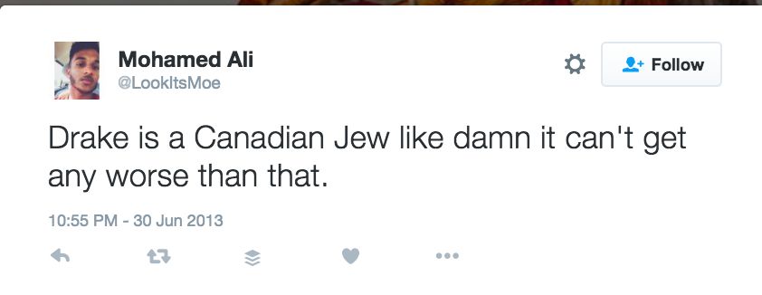 On June 30, 2013, Ali tweeted:“Drake is a Canadian Jew like damn it can't get any worse than that.”