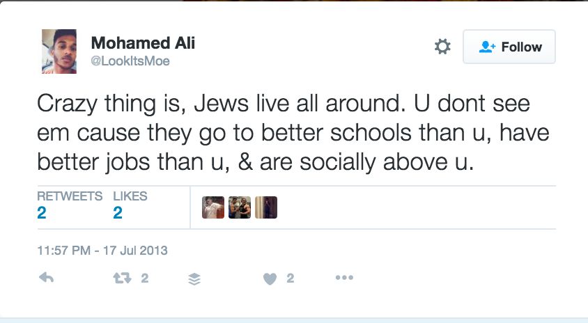 Eyad Hijer on July 17, 2014 tweeted to a Jewish person — “‘...I already hate you. You dirty filthy Jew. All your people do is f**ked s**t up. Wish hitler was still around to show you guys.”