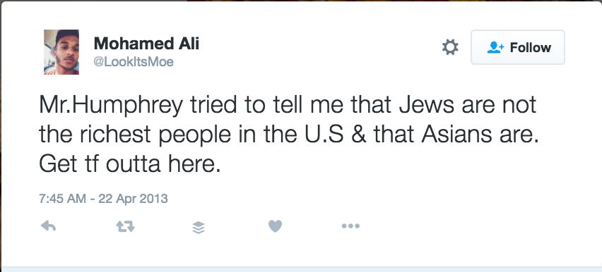 On April 22, 2013, Ali tweeted: “Mr.Humphrey tried to tell me that Jews are not the richest people in the U.S & that Asians are. Get tf outta here.”
