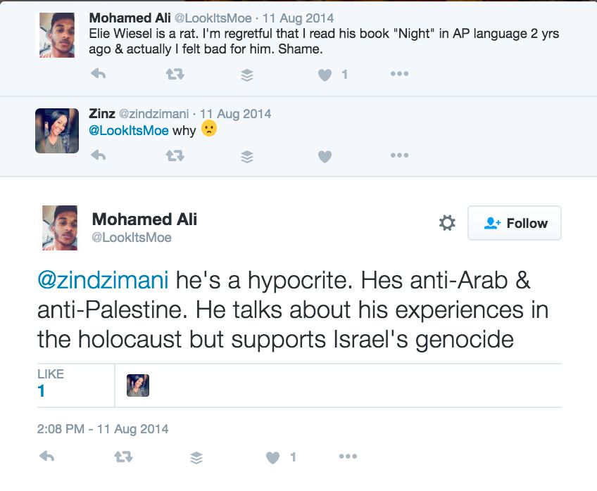 On August 11, 2014, Ali tweeted: “Elie Wiesel is a rat. I'm regretful that I read his book ‘Night’ in AP language 2 yrs ago & actually I felt bad for him. Shame.”