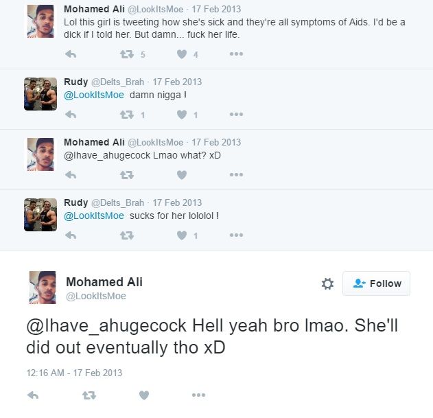 On February 17, 2013 Ali tweeted: “Lol this girl is tweeting how she's sick and they're all symptoms of Aids. I'd be a dick if I told her. But damn... f**k her life.”Later that day, responding to others who joined in mocking the ill girl, Ali tweeted: “Hell yeah bro lmao. She'll did out eventually tho xD”