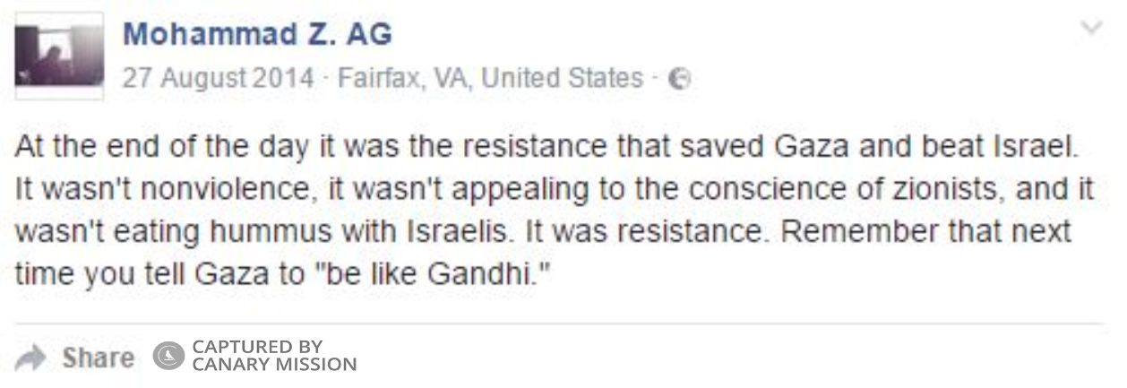 Abou-Ghazala embedded a BDS petition he created, calling on George Mason University Dining Services to boycott Sabra Hummus. The petition labelled Israel an “apartheid” state, and accused the IDF of “various human rights violations, including the slaughter of at least 1,400 Palestinian civilians during a siege on the Gaza Strip in 2009.”