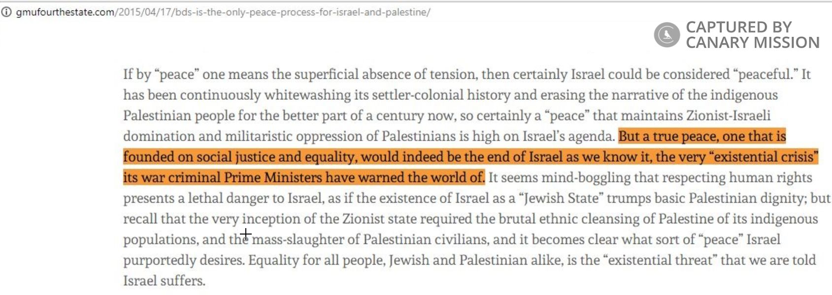 On April 17, 2015, Abou-Ghazala wrote an article for GMU’s student newspaper in which he promoted BDS. In the article, he claimed “the very inception of the Zionist state required the brutal ethnic cleansing of Palestine of its indigenous populations, and the mass-slaughter of Palestinian civilians.”