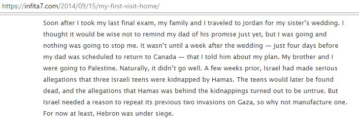 In his blog post, Horreya alleged that “the allegations that Hamas was behind the kidnappings turned out to be untrue” and that “Israel needed a reason to repeat its previous two invasions on Gaza, so why not manufacture one.”