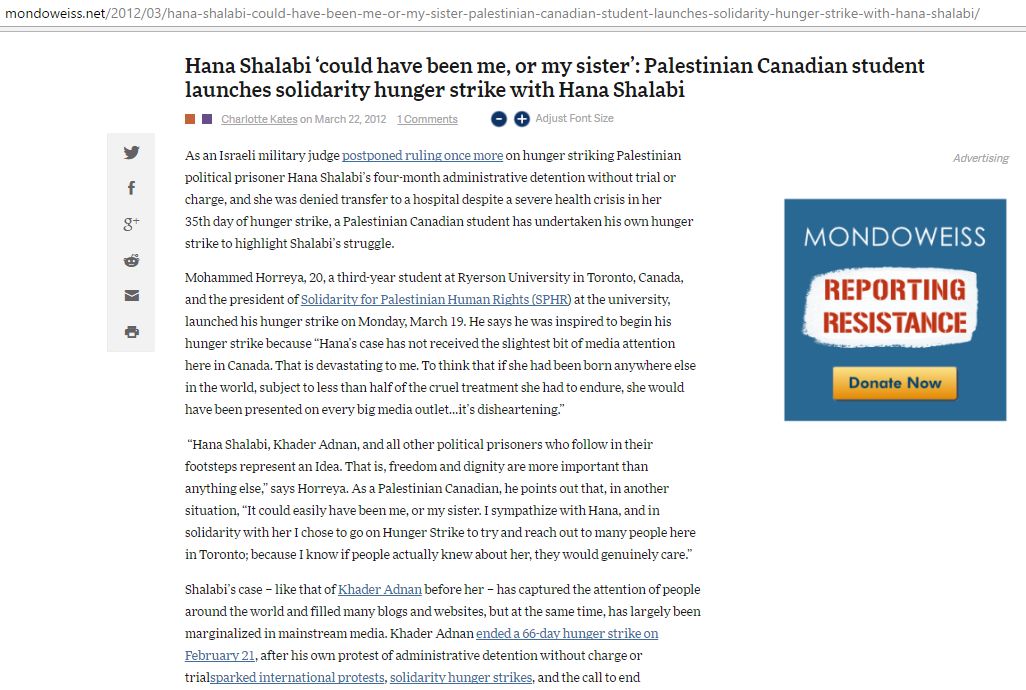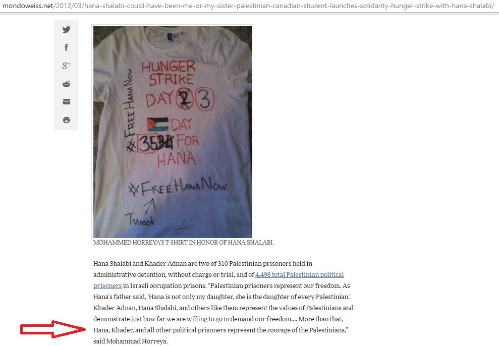In the article, Horreya was quoted supporting Khader Adnan: “Hana, Khader, and all other political prisoners represent the courage of the Palestinians.”