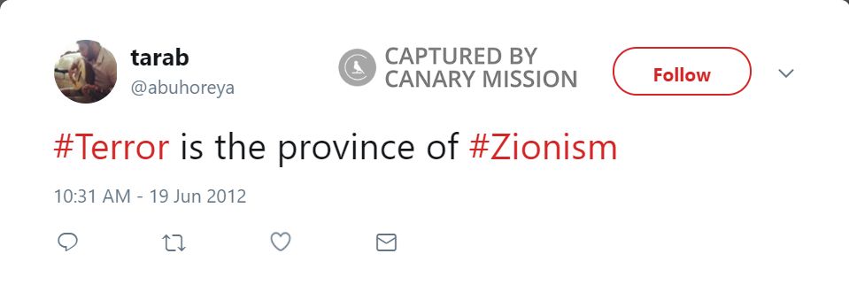 On June 19, 2012, Horreya tweeted: “#Terror is the province of #Zionism.”