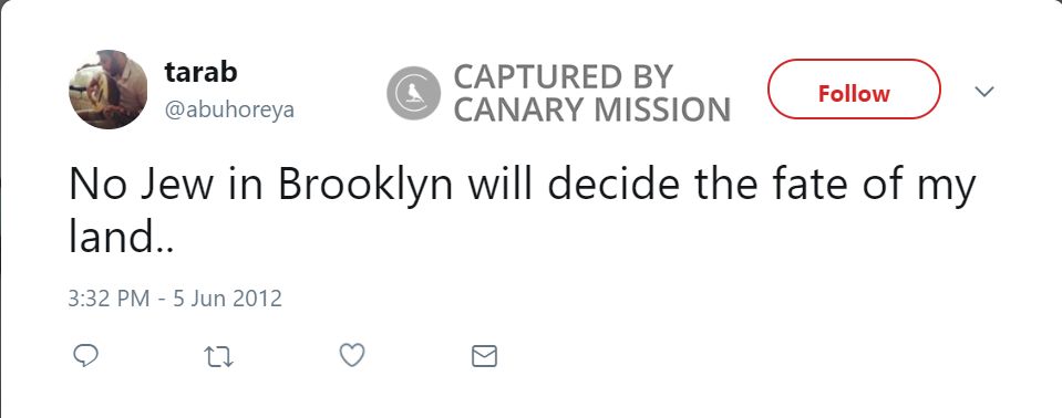 On June 5, 2012, Horreya tweeted: “No Jew in Brooklyn will decide the fate of my land..”