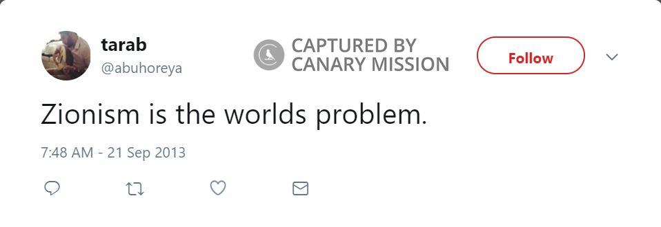 On September 21, 2013, Horreya tweeted: “Zionism is the worlds problem.”