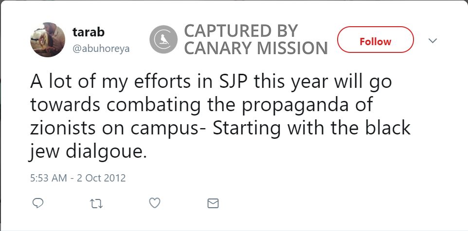 On October 2, 2012, Horreya tweeted: “A lot of my efforts in SJP this year will go towards combating the propaganda of zionists on campus- Starting with the black jew dialgoue.”