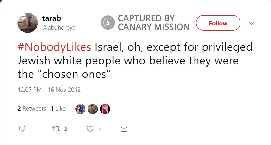 On November 16, 2012, Horreya tweeted: “#NobodyLikes Israel, oh, except for privileged Jewish white people who believe they were the ‘chosen ones’”