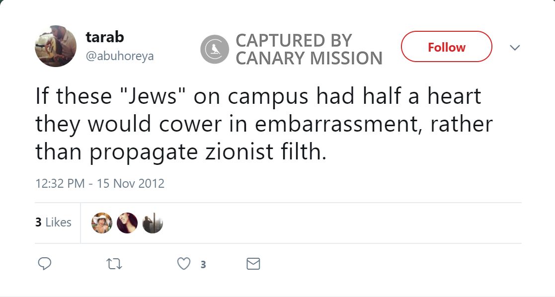 On November 15, 2012, Horreya tweeted: “If these ‘Jews’ on campus had half a heart they would cower in embarrassment, rather than propagate zionist filth.”