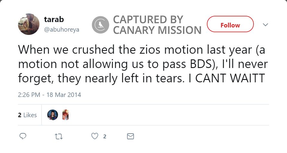 On March 18, 2014, Horreya tweeted: “When we crushed the zios motion last year (a motion not allowing us to pass BDS), I'll never forget, they nearly left in tears. I CANT WAITT.”
