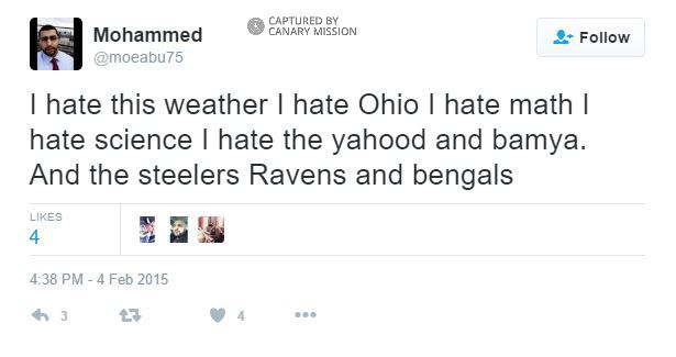 “I hate this weather I hate Ohio I hate math I hate science I hate the yahood [Jews] and bamya. And the steelers Ravens and bengals.”