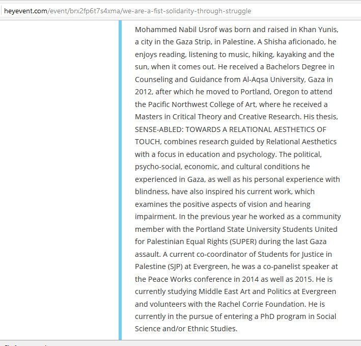 He is also a member of the Portland State University (PSU) Students United for Palestinian Equal Rights (SUPER PSU), a campus organization that has hosted a slew of anti-Israel events at PSU since 2015.
