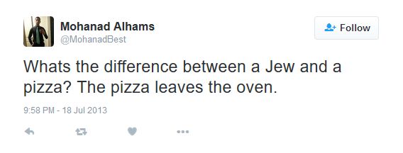 On July 18, 2013, Alhams tweeted: “Whats the difference between a Jew and a pizza? The pizza leaves the oven.”