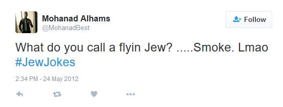 On July 18, 2013, Alhams tweeted: “What do you call a flying Jew? Smoke.”