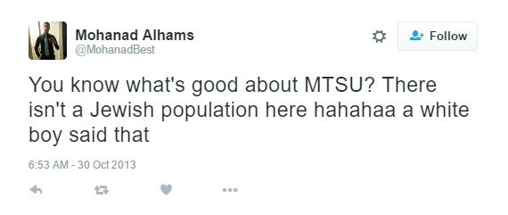 On October 30, 2013, Alhams tweeted: “You know what's good about MTSU? There isn't a Jewish population here hahahaa a white boy said that.”