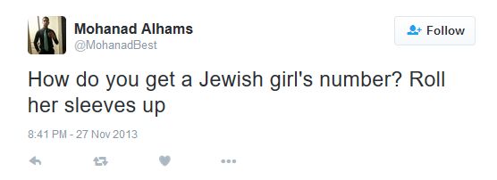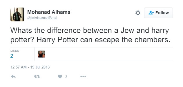 On November 27, 2013, Alhams tweeted: “How do you get a Jewish girl's number? Roll her sleeves up.”On July 18, 2013, Alhams tweeted: “Whats the difference between a Jew and harry potter? Harry Potter can escape the chambers.”