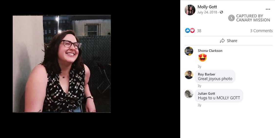 Molly Gott has spread incitement, demonized a Jewish organization and a Philadelphia philanthropist and has engaged in anti-Israel activism.Gott was reportedly a member of Jewish Voice for Peace (JVP) Philadelphia (JVP Philly) in 2021 and has been affiliated with JVP since 2017.