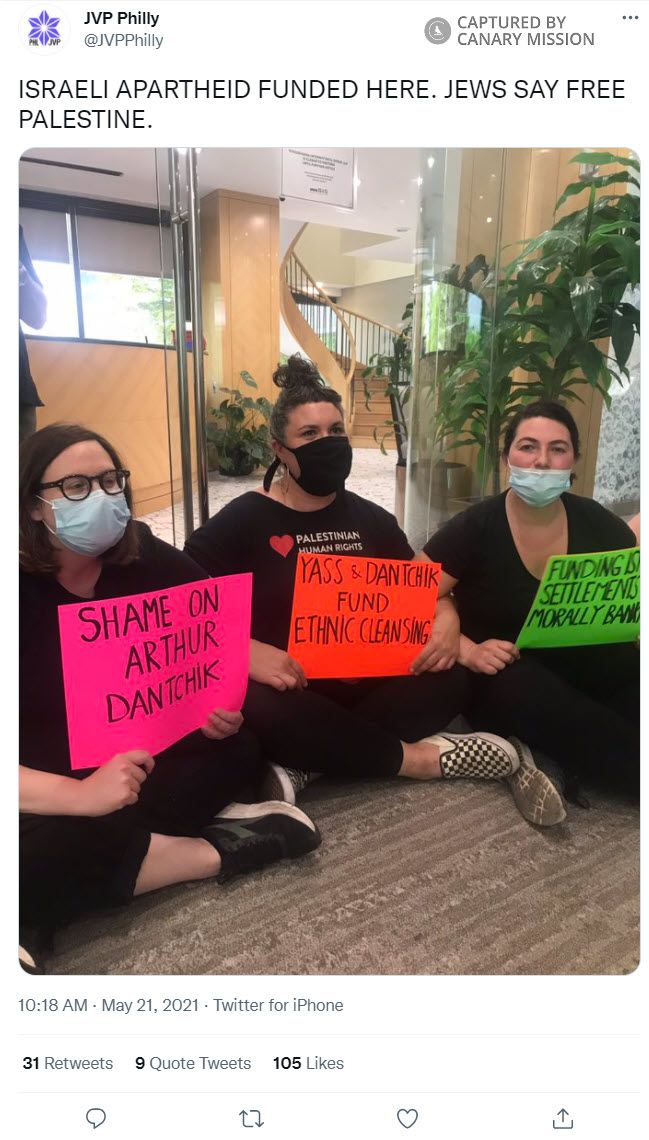 On May 21, 2021, JVP Philly held a sit-in at the lobby of Yass’s office in Philadelphia. Protesters held anti-Israel banners outside the office and accused [00:00:40] Yass and his business partner, Arthur Dantchik, of “funding genocide, apartheid and ethnic cleansing” in Israel, as they chanted [00:00:52]: “Israeli apartheid is funded here, Jews say Free Palestine.”