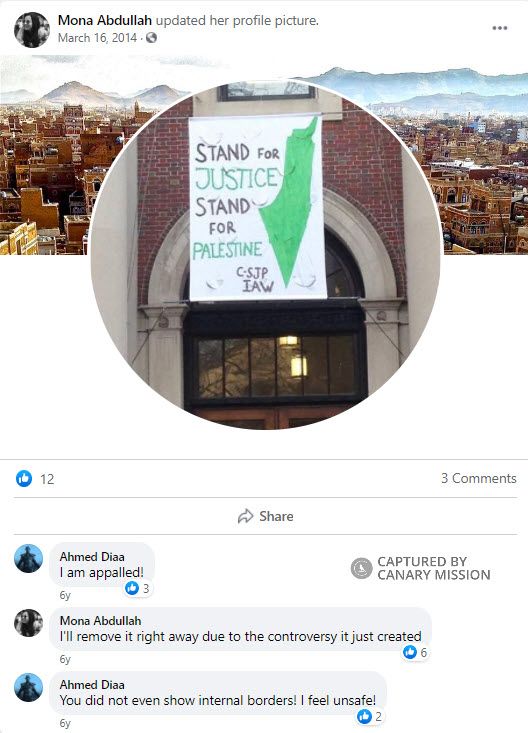 On April 21, 2013, Abdullah organized and promoted a press conference launched by members of the Barnard and Columbia faculty, calling on College Retirement Equities Fund TIAA-CREF (Teachers Insurance and Annuity Association – College Retirement Equities Fund ) to divest from Israeli corporations, including Elbit Systems, Hewlett-Packard and Veolia.On April 23, 2013, Abdullah was listed as a point of contact on Columbia SJP’s“Barnard and Columbia Faculty to Hold Press Conference Calling for Divestment” Facebook event.