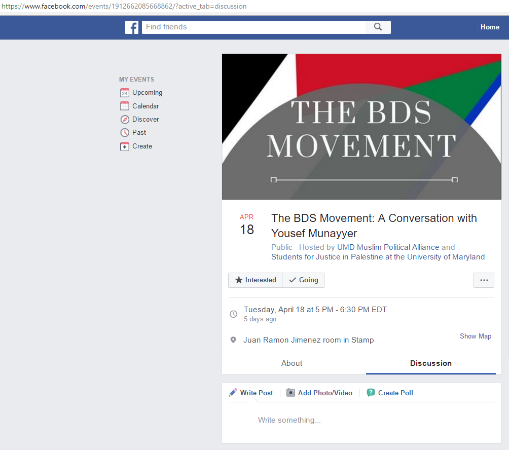 On February 26, 2017, SJP UMD released an online petition, titled “OFFICIAL STATEMENT ON BDS,” addressed to the UMD SGA and UMD President, Wallace Loh. The petition was circulated in anticipation of the anti-Israel divestment bill that was co-authored by UMD MASC and SJP UMD and announced on Facebook by Sarah Eshera — UMD MASC founder and SJP UMD activist, on April 10, 2017.