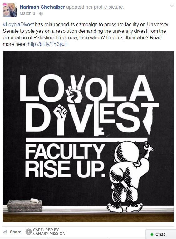 On March 3, 2016, Shehaiber posted to Facebook: “#LoyolaDivest has relaunched its campaign to pressure faculty on University Senate to vote yes on a resolution demanding the university divest from the occupation of Palestine.”In 2015, LoyolaDivest stated on their website “about” page that they passed a 2015 divestment resolution targeting “corporations [are] complicit in the violation of Palestinian rights” and profit from the “furthering the oppression of Palestinians through mass destruction and overall degradation of human rights.”