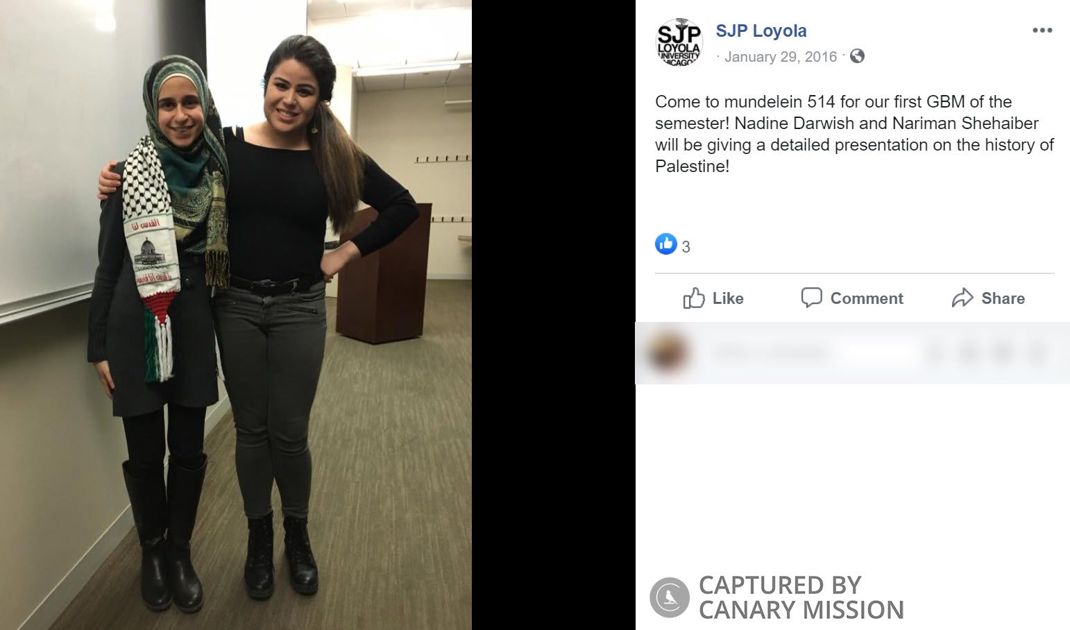 Nariman Shehaiber was the 2016 president and primary contact for Students for Justice in Palestine (SJP) at Loyola University (Loyola). Shehaiber was an activist with the Boycott, Divestment, Sanctions (BDS) movement and pushed divestment efforts at Loyola while SJP president.As of September 2020, Shehaiber was a member of the Muslim Student Association (MSA) at Loyola’s Facebook group “Loyola MSA,” since March 2015.