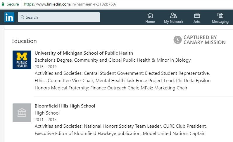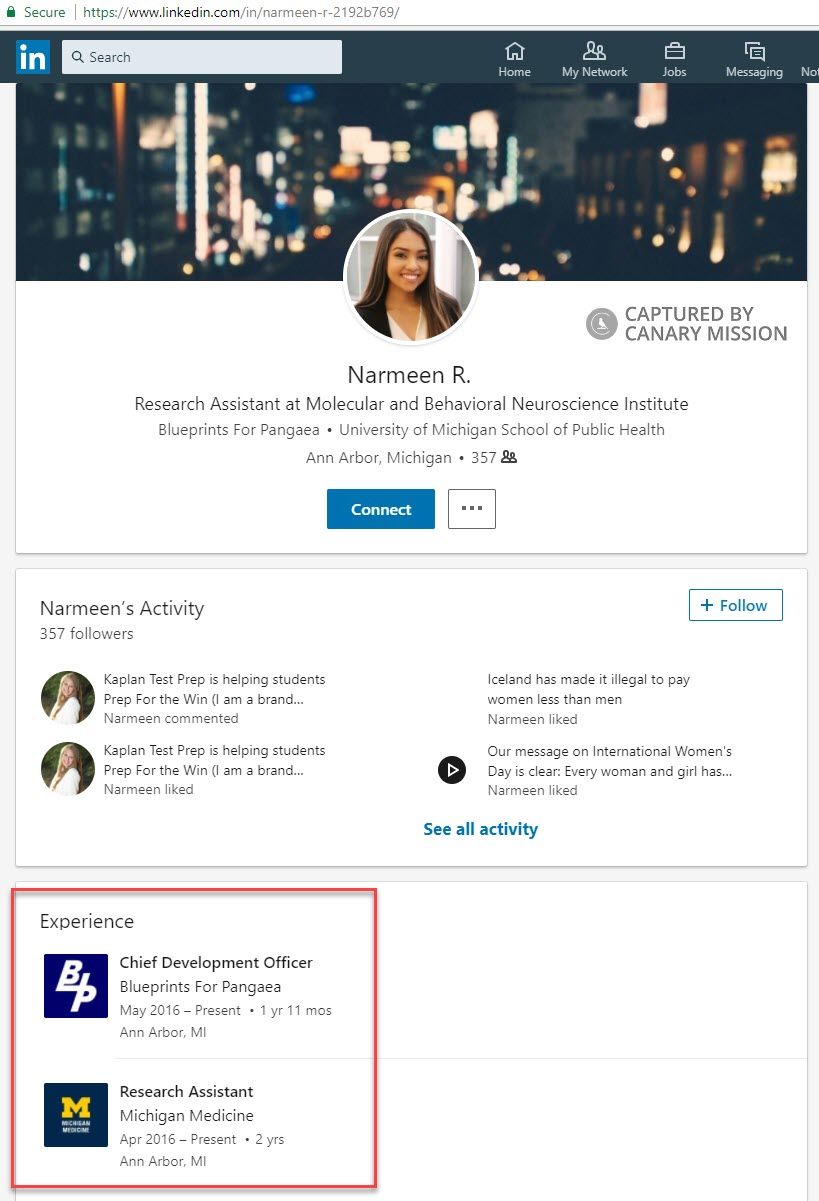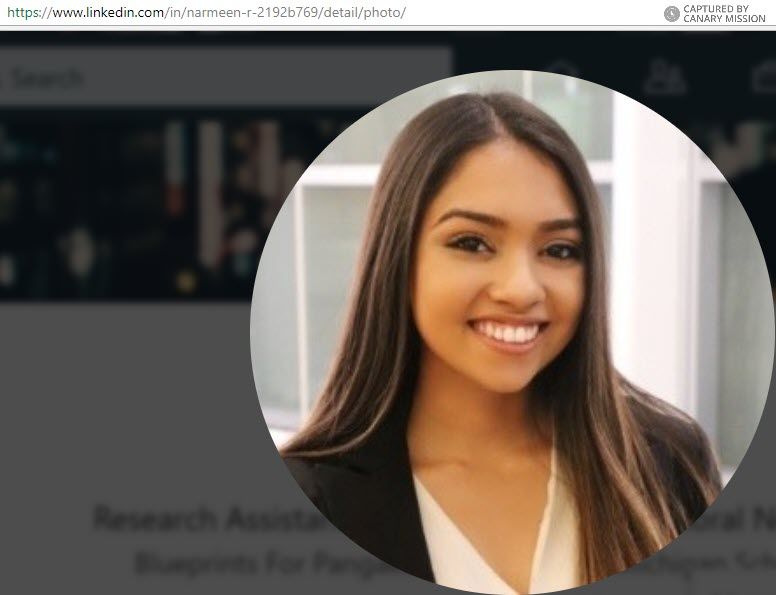 Narmeen Rehman supported an anti-Israel Boycott, Divestment, Sanctions (BDS)resolution as a student representative in the University of Michigan, Ann Arbor (UM Ann Arbor) Central Student Government (CSG), in 2017.As of March 2018, Rehman indicated on LinkedIn that she was studying Community and Global Public Health at UM Ann Arbor. She is also a research assistance at UM Ann Arbor’s Molecular and Behavioral Neuroscience Institute.