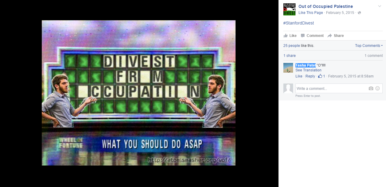 On February 17, 2015, the Stanford Undergraduate Senate voted in favor of a SOOP resolution calling on Stanford to divest from corporations that "maintain the occupation of Palestine."