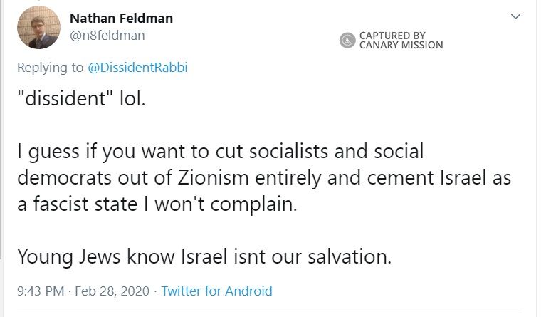 On February 28, 2020, Feldman tweeted:“‘dissident’ lol. I guess if you want to cut socialists and social democrats out of Zionism entirely and cement Israel as a fascist state I won't complain. Young Jews know Israel isnt our salvation.”