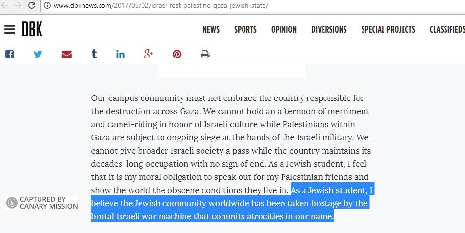Feldman authored an opinion piece published on May 2, 2017, in the UMD student newspaper, titled: “Israel does not deserve to be celebrated.”