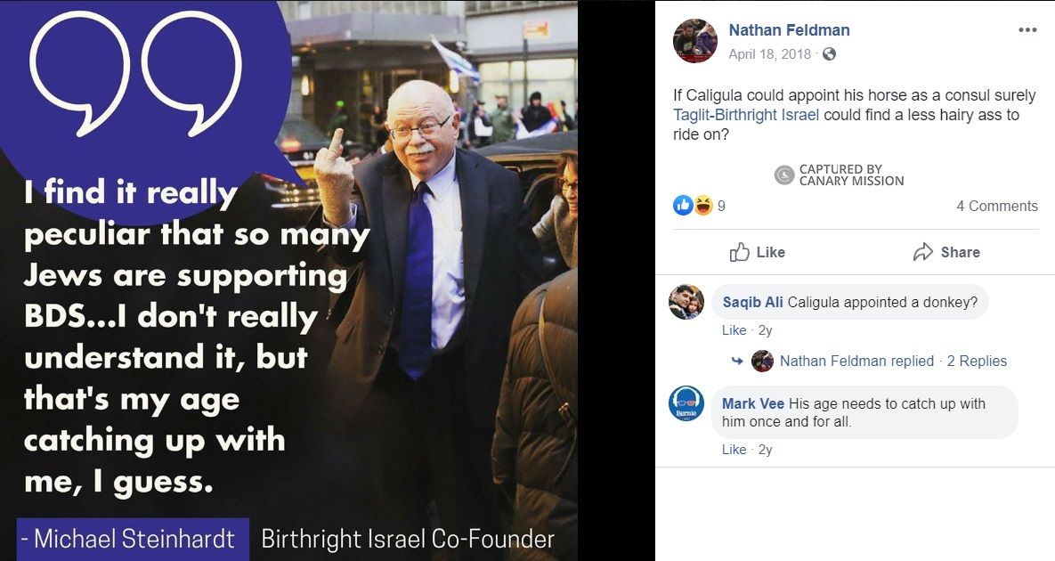 On April 18, 2018, Feldman posted a photo to Facebook of Jewish philanthropist Michael Steinhardt, including a quote attributed to Steinhardt against BDS and commented: “If Caligula could appoint his horse as a consul surely Taglit-Birthright Israel could find a less hairy a** to ride on?”