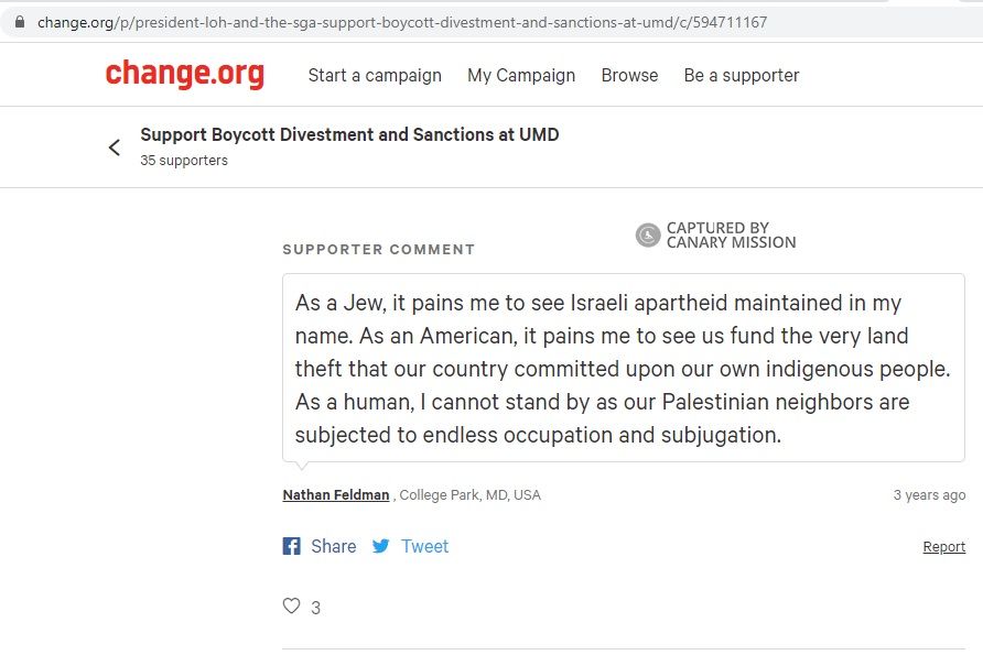 Nathan Feldman has expressed support for violent protesters and demonized Israel, as well as American support for Israel. He has also expressed support for anti-Israel agitators and was an activist with Students for Justice in Palestine (SJP), at the University of Maryland, College Park (SJP UMD) in 2017.SJP UMD joined with the Muslim Association for Social Change (MASC) at UMD (UMD MASC) to promote BDS. UMD MASC wasknown as the UMD Muslim Political Alliance (MPA) prior to August 3, 2017.