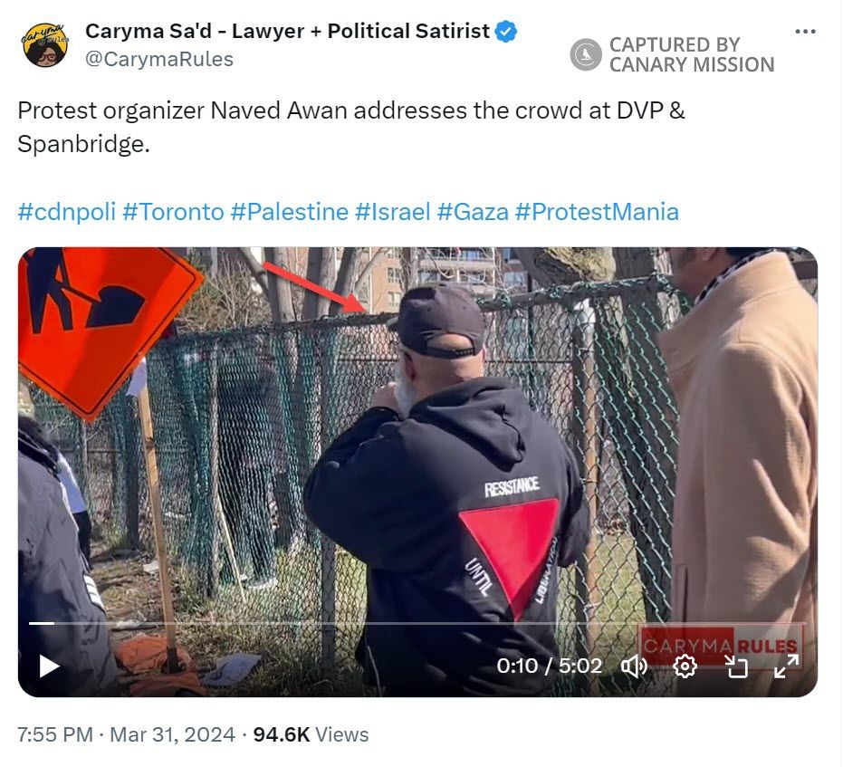 A video from the encampment posted on Instagram on May 5 showed [00:04:13] Bahadur wearing a baseball cap with “Resistance Until Liberation” written on its side and a Toronto4Palestine sweatshirt with a red inverted triangle logo on the sleeve, indicating support for Hamas.