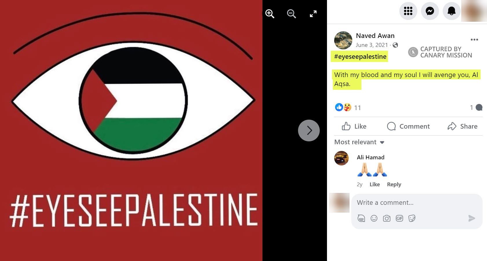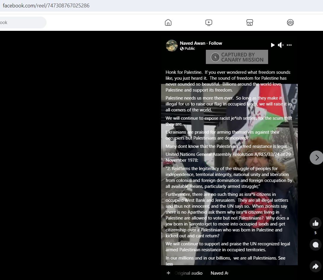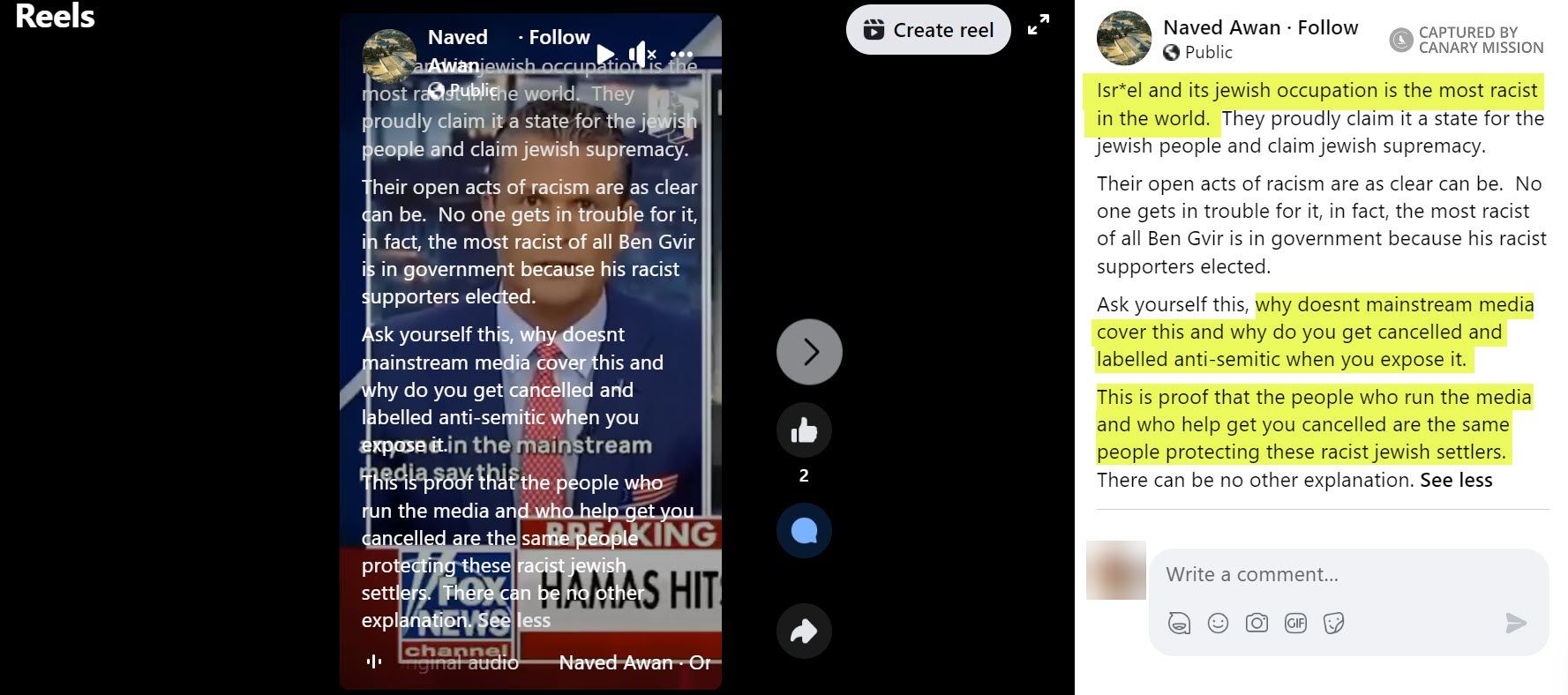 Bahadur captioned a December 10, 2023, Facebook Reel: “The flag & the resistence [sic] & the suffering…it is all for Musjid [mosque] al Aqsa…May Allah give shame to the oppressors & occupiers and rid them from this world…”The allegation that Jews “threaten” to destroy the Al-Aqsa Mosque has been a pretext for Arab attacks on Jews long before the existence of the modern Jewish state. Such propaganda has led to multiple periods of violence against Israeli civilians.