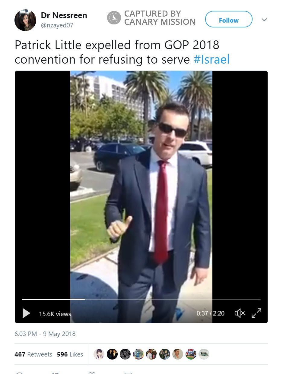 On May 9, 2018, Barbarawi tweeted: “Patrick Little expelled from GOP 2018 convention for refusing to serve #Israel.”The tweet featured a video ofRepublican candidate for the United States senate, Patrick Little after he was kicked out of the Republican California GOP Convention for his anti-Semitic views.