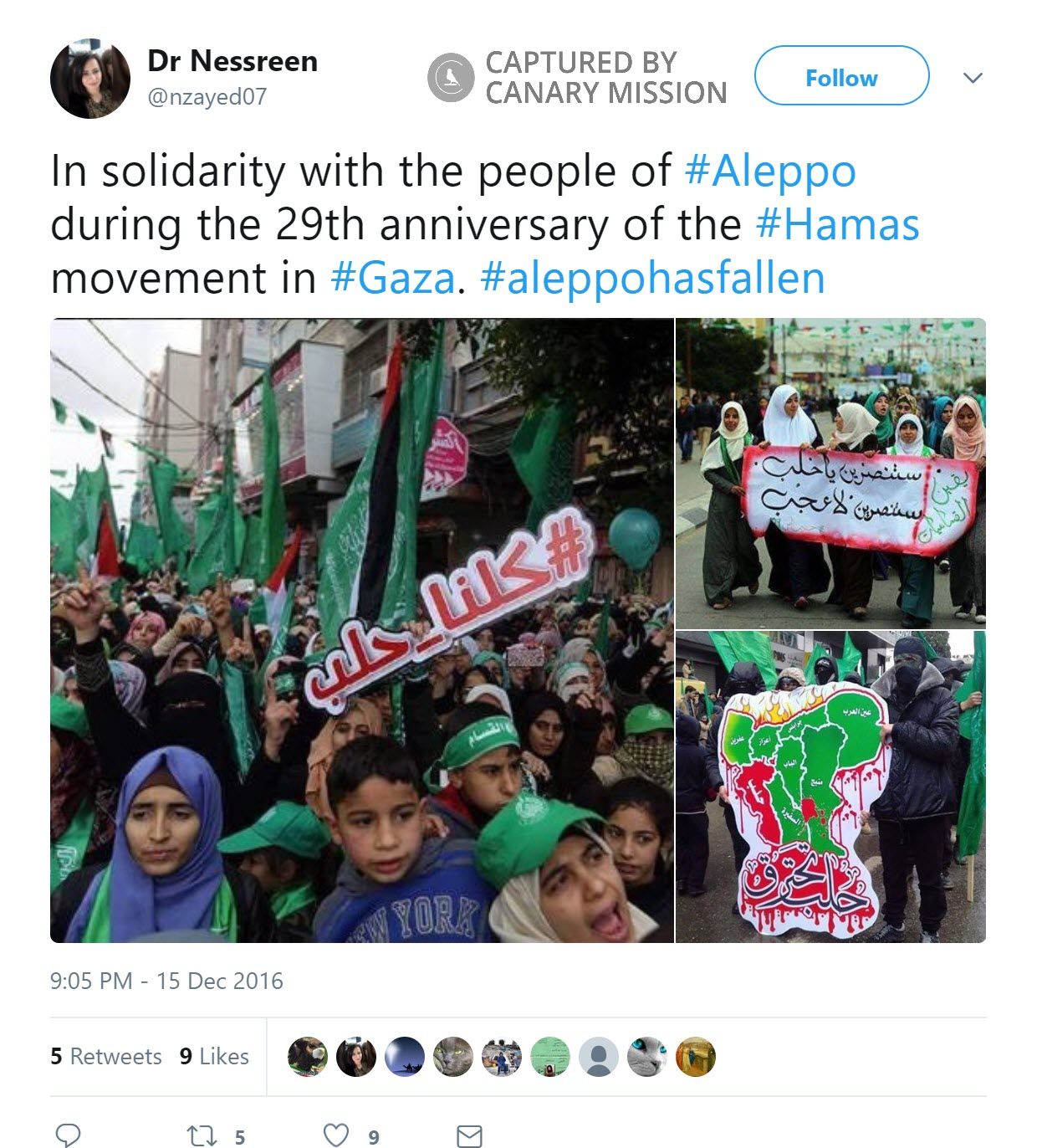 On December 15, 2016, Barbarawi tweeted: “In solidarity with the people of #Aleppo during the 29th anniversary of the #Hamas movement in #Gaza. #aleppohasfallen.”The tweet featured photos of demonstrators holding Hamas flags at the 29th anniversary of the movement’s founding.