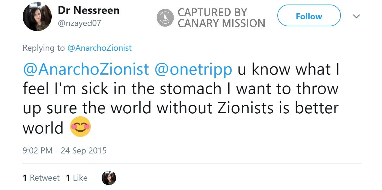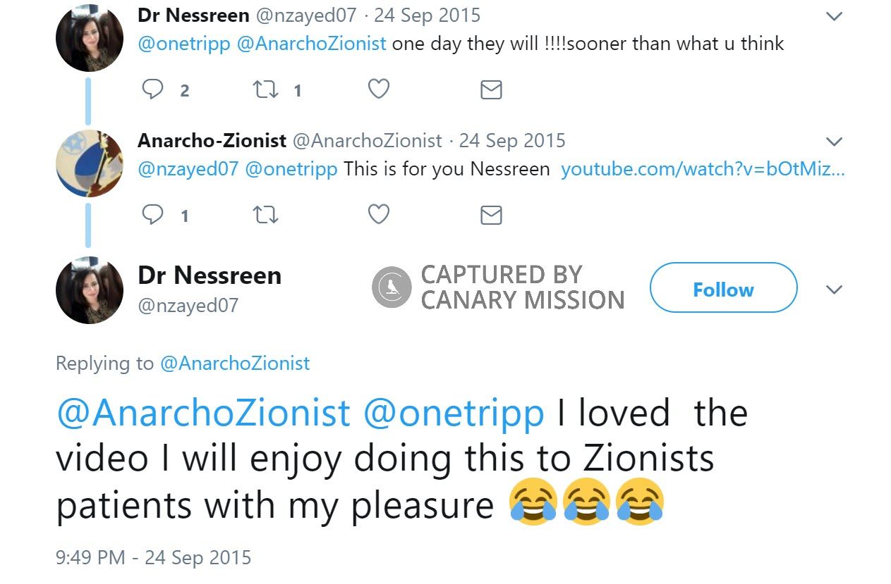 On September 24, 2015, in response to a tweet that read:”@nBarbarawi07 @onetripp This is for you Nessreen https://www.youtube.com/watch?v=bOtMizMQ6oM …” Barbarawi tweeted: “@AnarchoZionist @onetripp I loved the video I will enjoy doing this to Zionists patients with my pleasure