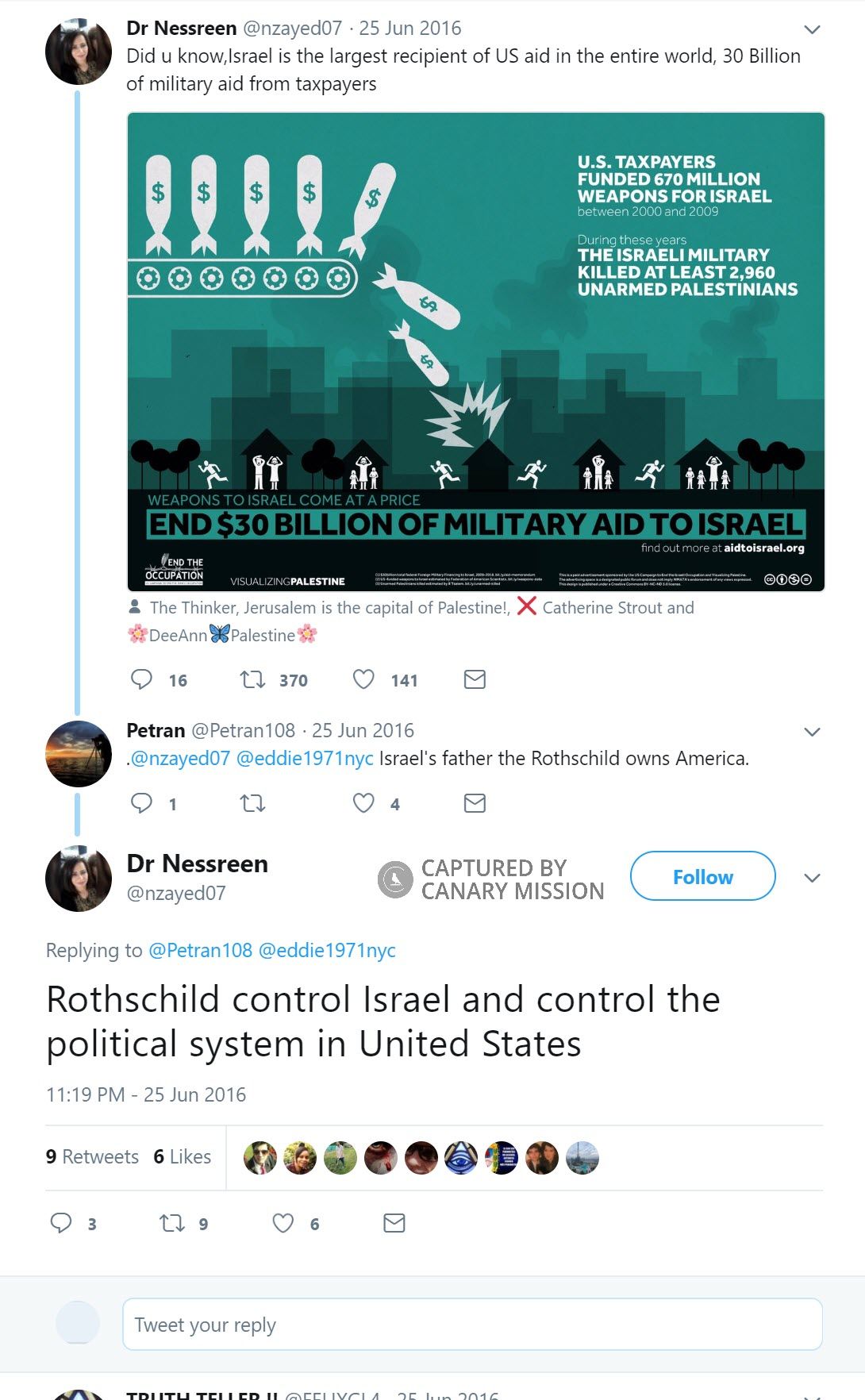On June 25, 2016, Barbarawi tweeted: “Did u know,Israel is the largest recipient of US aid in the entire world, 30 Billion of military aid from taxpayers.”