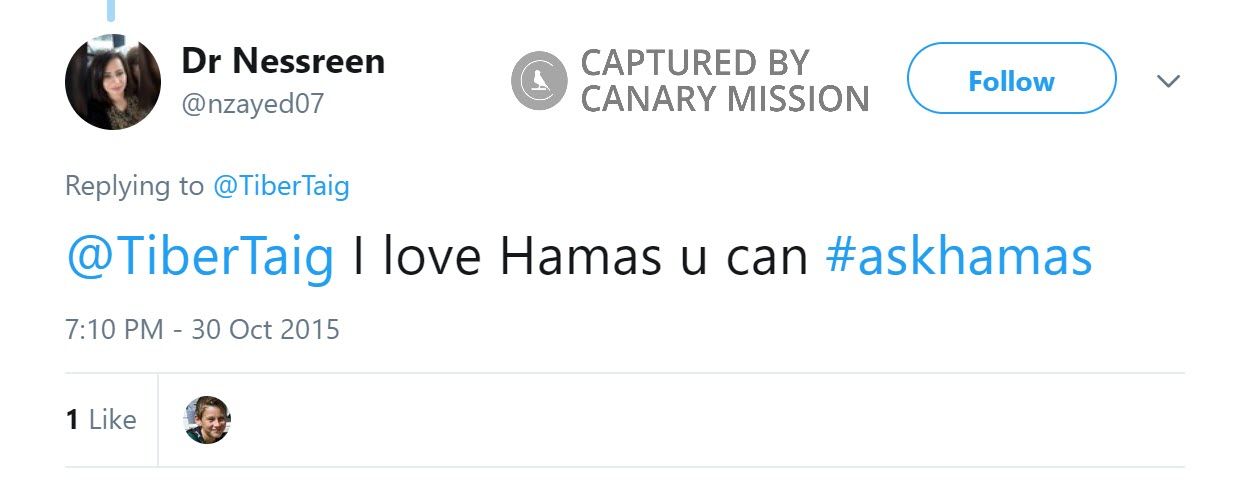 Nessreen Barbarawi [Nessreen Zayed] is a dentist who has joked about torturing “Zionists patients.” She has also expressed support for Hamas and for anti-Israel terrorism.Barbarawi promoted United States Senate candidate Patrick Little, who ran as a Republican in 2018, promoting an anti-Jewish neo-Nazi platform.