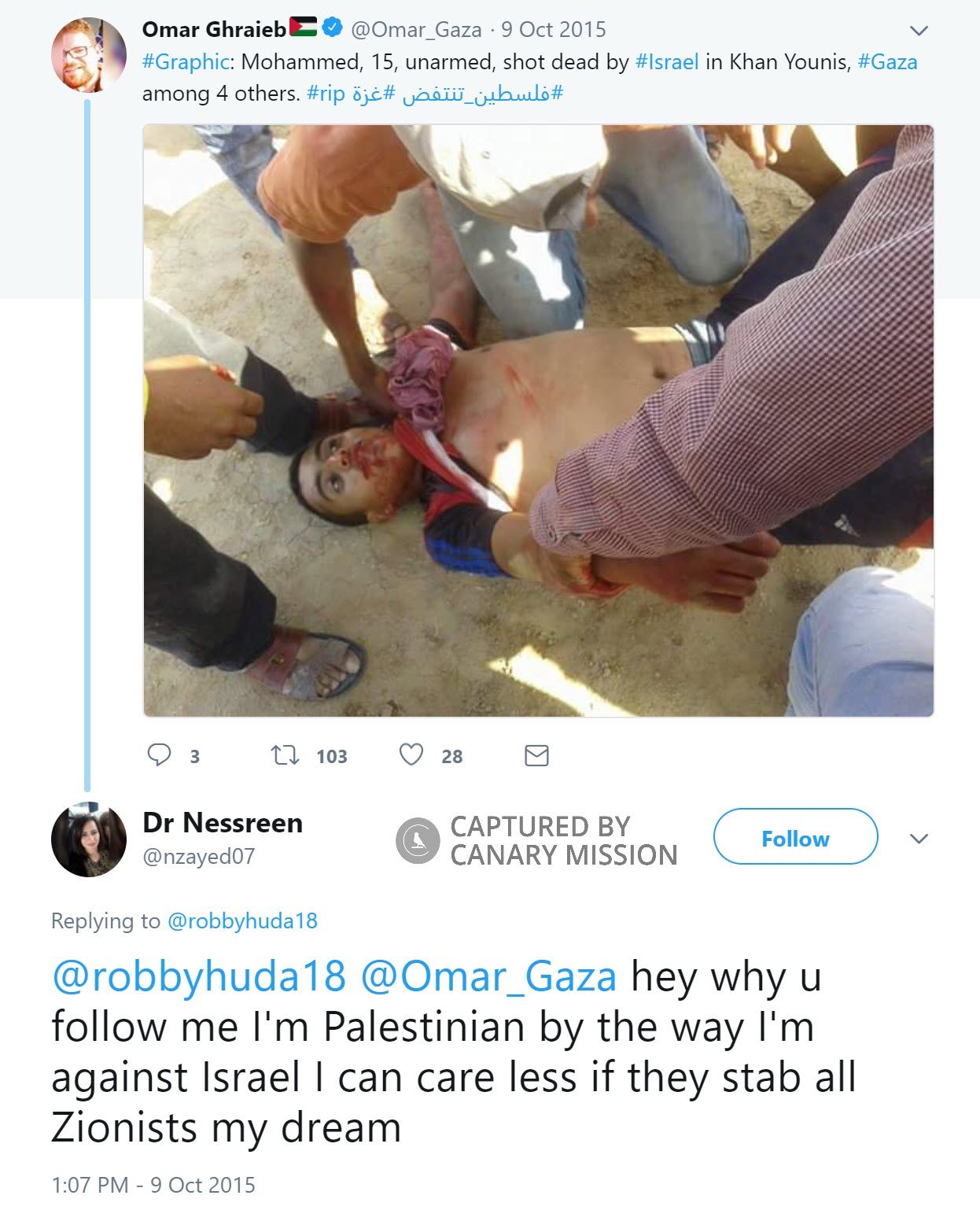 On October 9, 2015, Barbarawi tweeted: “@robbyhuda18 @Omar_Gaza hey why u follow me I'm Palestinian by the way I'm against Israel I can care less if they stab all Zionists my dream.”