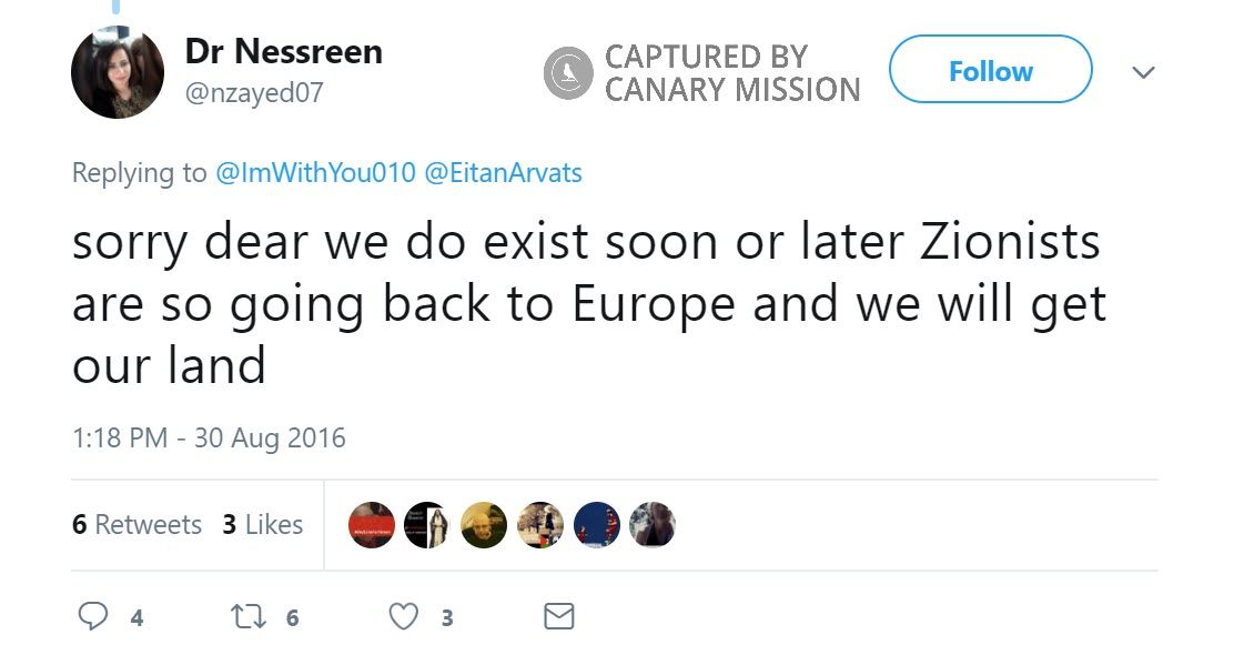 On August 30, 2016, Barbarawi tweeted: “sorry dear we do exist soon or later Zionists are so going back to Europe and we will get our land.”