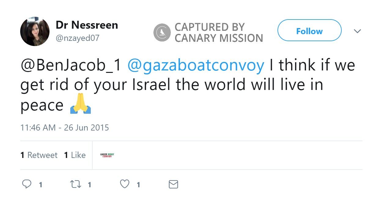 ”On June 26, 2015, Barbarawi tweeted: “@BenJacob_1 @gazaboatconvoy I think if we get rid of your Israel the world will live in peace